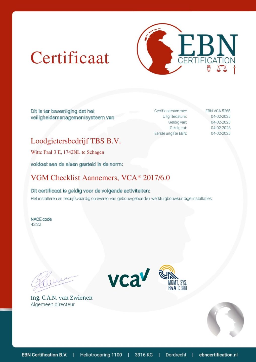Wij zijn VCA-gecertificeerd. Dat betekent dat wij zorg dragen voor veiligheid, gezondheid en milieu. De Europese normen zijn opgesteld om veiliger te werken, waarbij we oog hebben voor de veiligheid van onze medewerkers en de toekomstige gebruikers van de installatie. Wij beschikken over VCA-certificeringen voor zowel Bedrijf als Personeel.